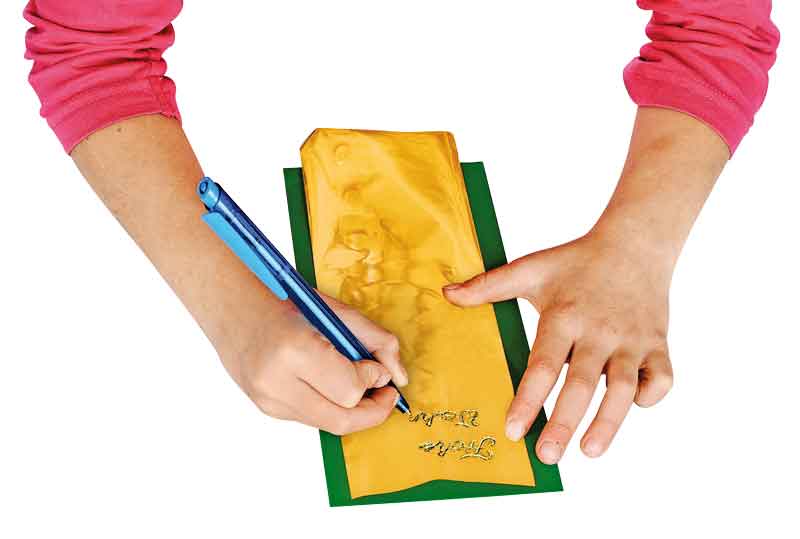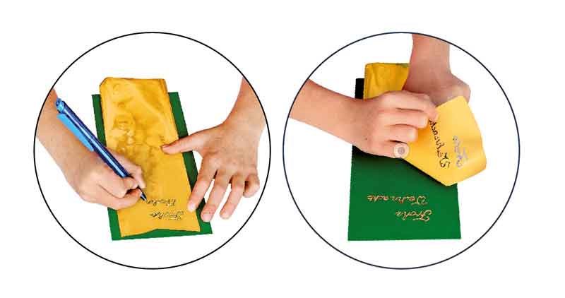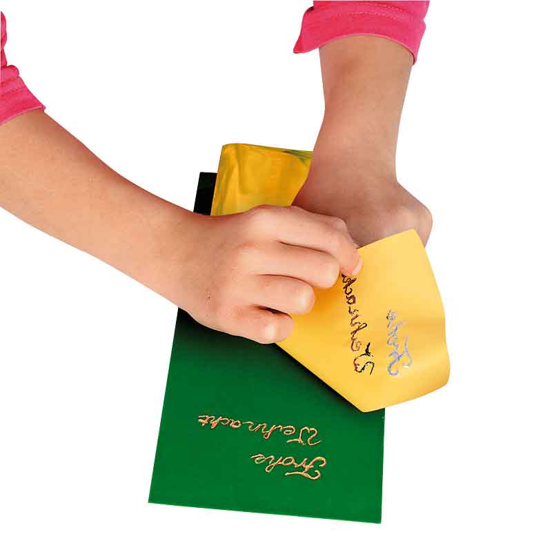 Die Folie wird mit der matten Seite nach unten auf den zu verzierenden Gegenstand aufgelegt und das gewünschte Motiv mit einem nicht zu spitzen Gegenstand durchgezeichnet (Kugelschreiber oder stumpfer Bleistift). Dabei überträgt sich die Metallicbeschichtung und bleibt beim Abziehen der Folie haften, sodass eine brillant glänzende Zeichnung oder Schrift zurückbleibt. Mit Beschriftungsfolie lassen sich in Verbindung mit dem 3-D-Mal-Klebepen auf Karten, Papier und Karton brillant glänzende Schriften herstellen: Die Schrift mit dem Klebepen auftragen, kurz antrocknen lassen, dann die Folie mit der matten Seite nach unten auf die Klebestelle aufdrücken und wieder abziehen. .