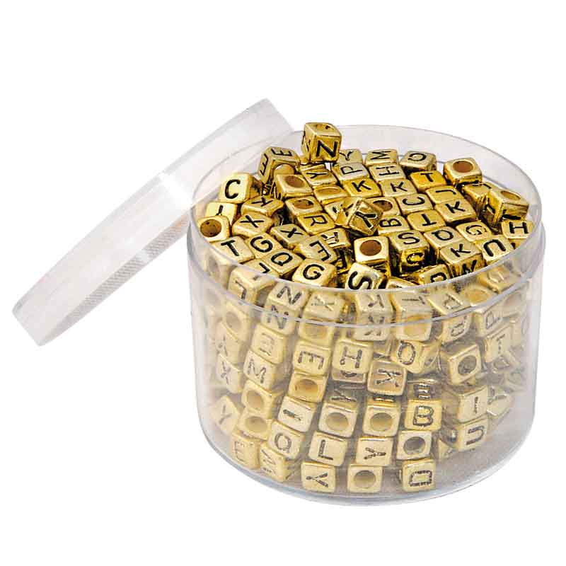 Metallische Würfelperlen aus Kunststoff mit schwarzen Buchstaben.