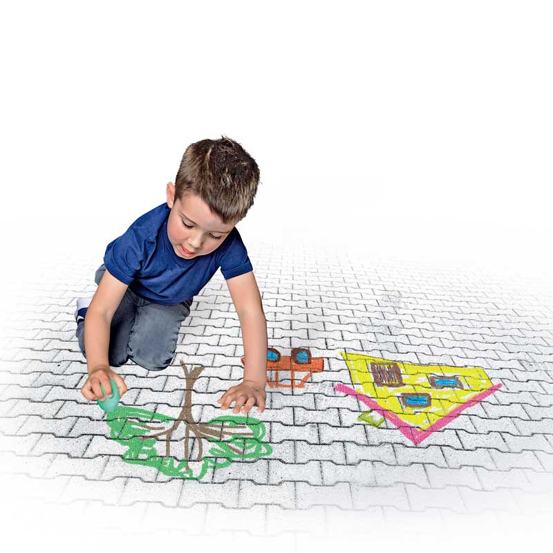 Mit den Straßenmalkreiden zaubern auch die Kleinsten spielend fantasievolle Kunstwerke auf den Asphalt. Jedoch nur bis zum nächsten Regenschauer: Der wäscht die Farben wieder weg.