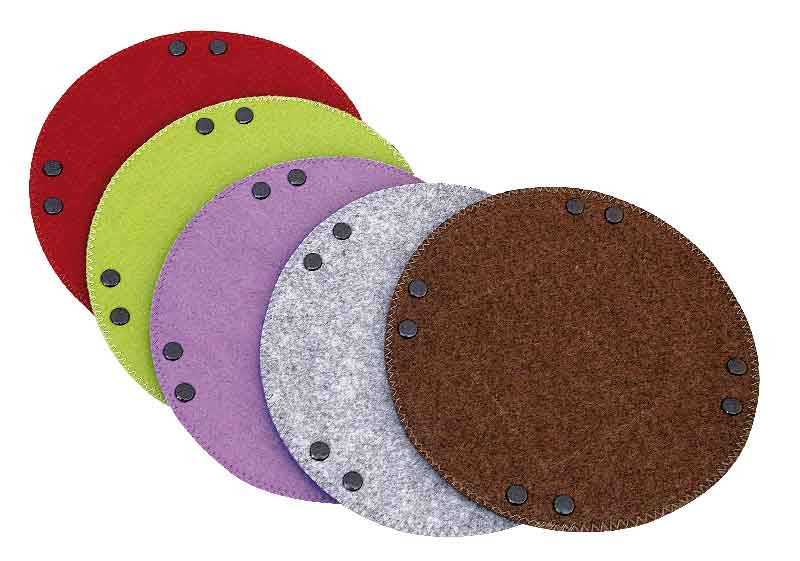 Quadratisches Osterkörbchen, das aus 3 mm starkem eingefasstem Filzkreis mit Druckknöpfen zum Osternest wird.