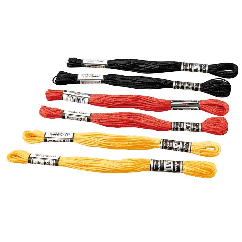 Garn in je 2 Stränge schwarz, rot und gelb.