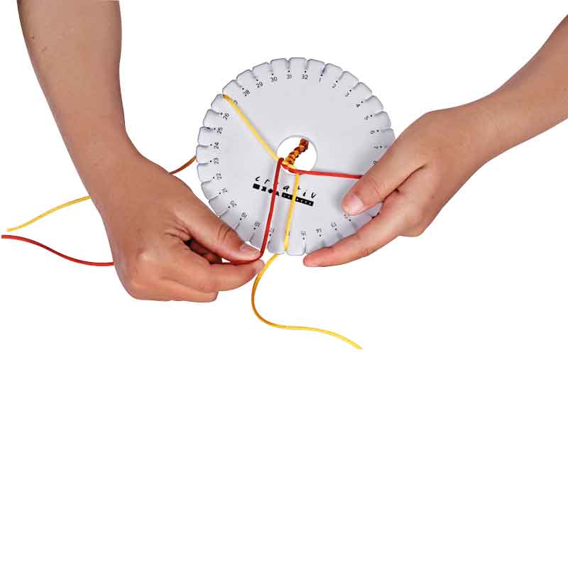 Aus dem Loch in der Mitte der runden Flechtscheibe können je nach Muster verschiedene Kordeln geflochten werden. Es entstehen Kordeln, die zu Armbänder, Minischlüsselbänder, Freundschaftsbänder u. v. m. verarbeitet werden.