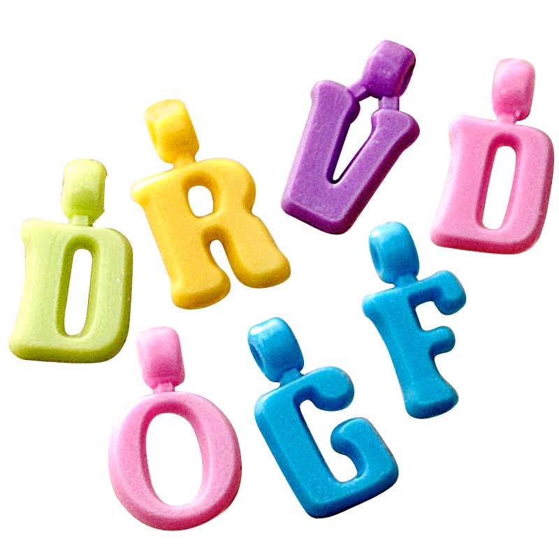Buchstaben haben eine Öse zum Auffädeln auf Ketten, Kordeln oder Armbänder.