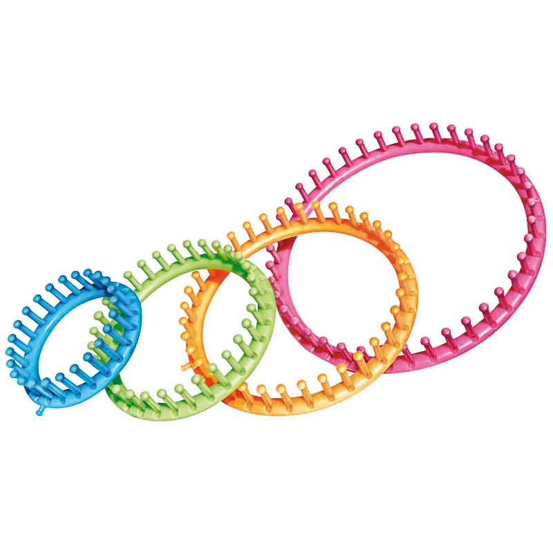 Strickringe: pink, 41 Maschen, 28 cm Durchmesser orange, 36 Maschen, 23 cm Durchmesser grün, 31 Maschen, 18 cm Durchmesser blau, 24 Maschen, 13,5 cm Durchmesser