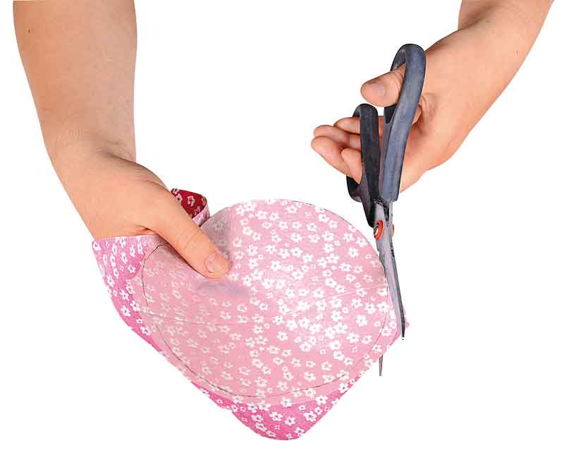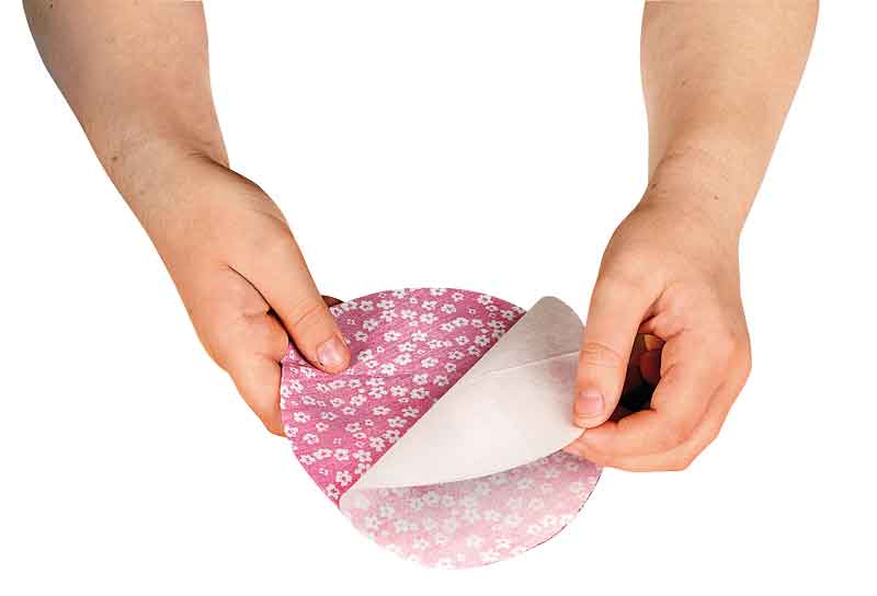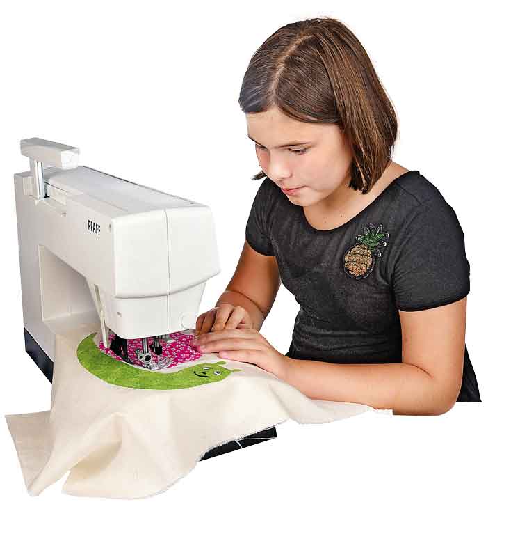 4. Danach mit der beschichteten Seite nach unten auf die gewählte Stelle eines anderen Stoffes auflegen. Mit feuchtem Tuch abdecken und schrittweise 10 Sek. bügeln. 5. Applikation mit Zick-Zack-Stich umnähen, bei Bedarf Stickvlies unterlegen.