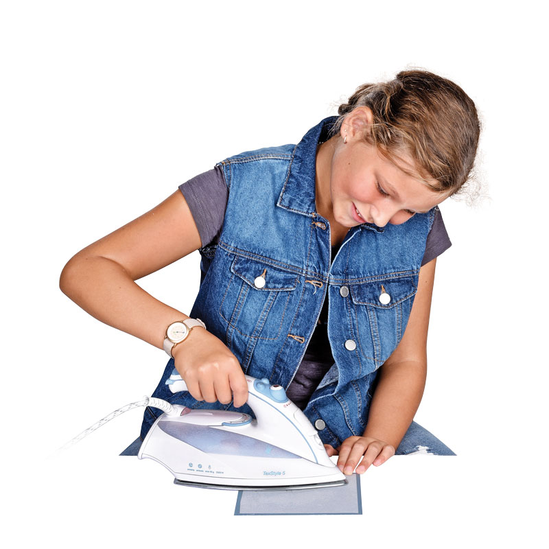 4. Danach mit der beschichteten Seite nach unten auf die gewählte Stelle eines anderen Stoffes auflegen. Mit feuchtem Tuch abdecken und schrittweise 10 Sek. bügeln. 5. Applikation mit Zick-Zack-Stich umnähen, bei Bedarf Stickvlies unterlegen.