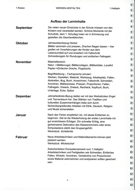 Erste Arbeitstechniken sind: Anordnen, Schneiden, Falten, Kleben, Wickeln, Einfädeln einer Nadel und Knoten. Erste Materialbereiche: Papier, Naturmaterial, Textiles Material, Wolle und Fäden.